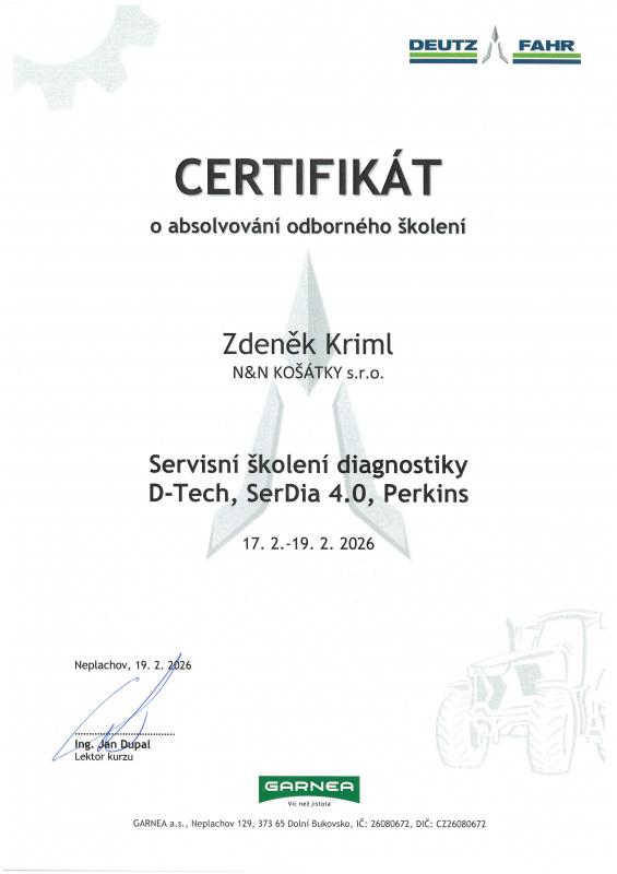 ZDENĚK KRIML - DEUTZ-FAHR Servisní školení diagnostiky D-Tech, SerDia 4.0, Perkins (17. až 19. 2. 2026)