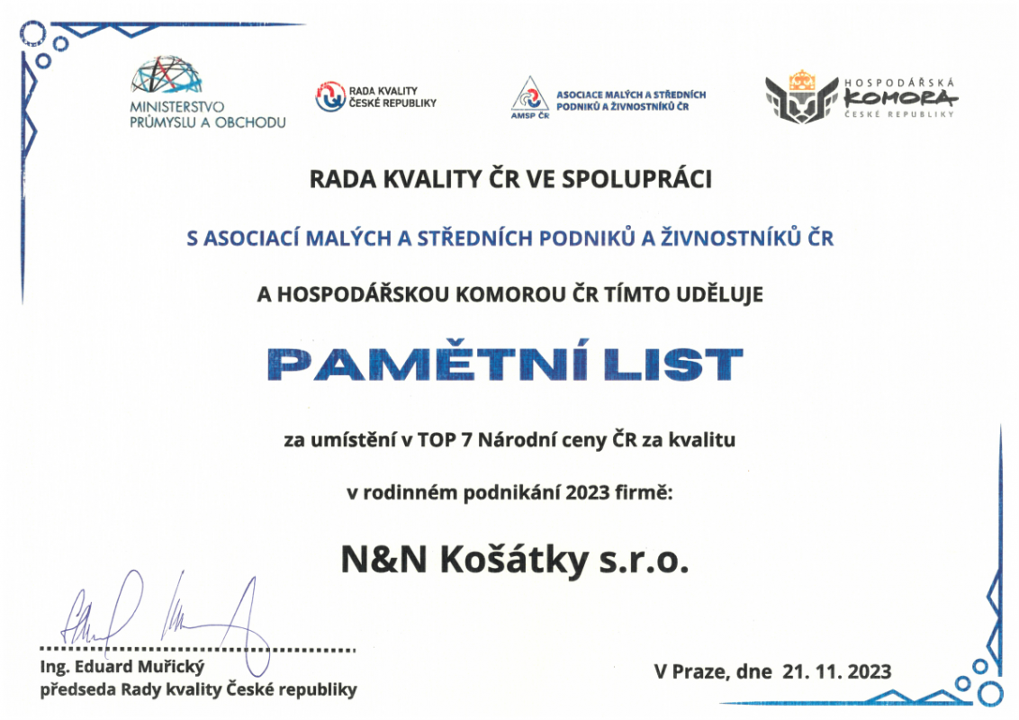 Pamětní list - za umístění v TOP 7 Národní ceny za kvalitu v rodinném podnikání v roce 2023