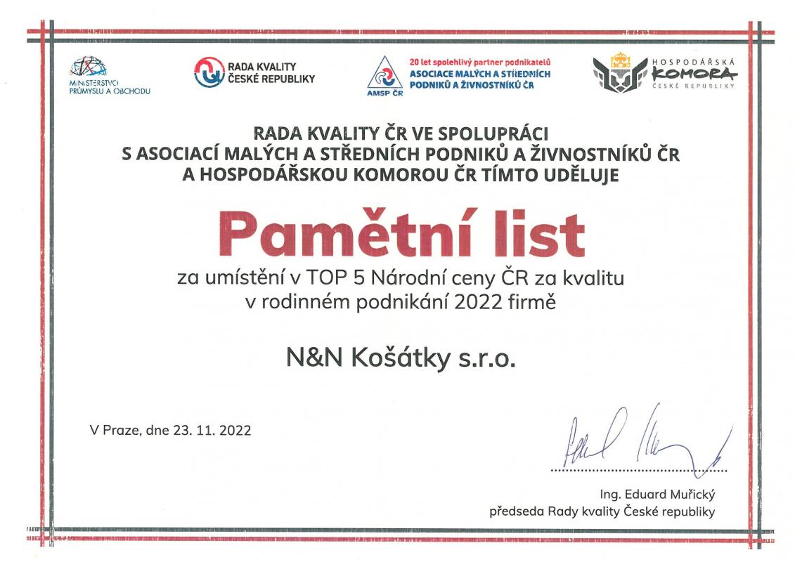 Pamětní list - za umístění v TOP 5 Národní ceny za kvalitu v rodinném podnikání v roce 2022